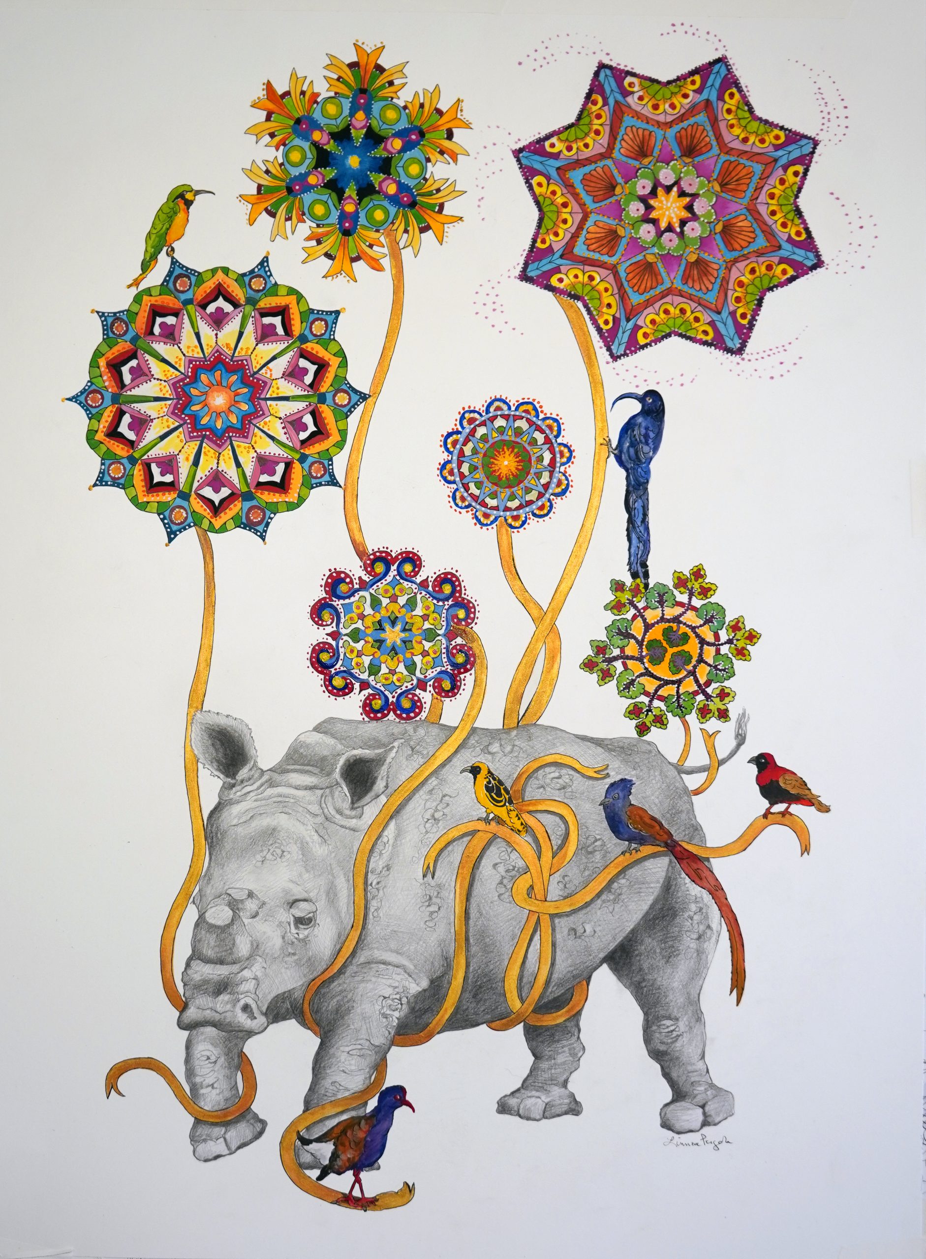 A detailed pencil drawing of a rhino with birds and mandalas. Rhinos are know for their stability, endurance and protection.
