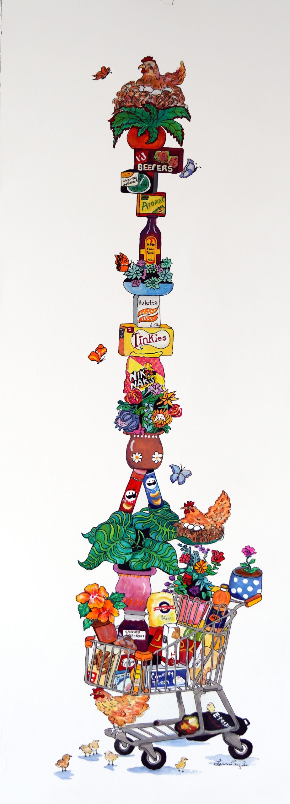 This is a whimiscal take on food shopping during spring.  Buying flowers but also having butterflies show up and chickens laying eggs.