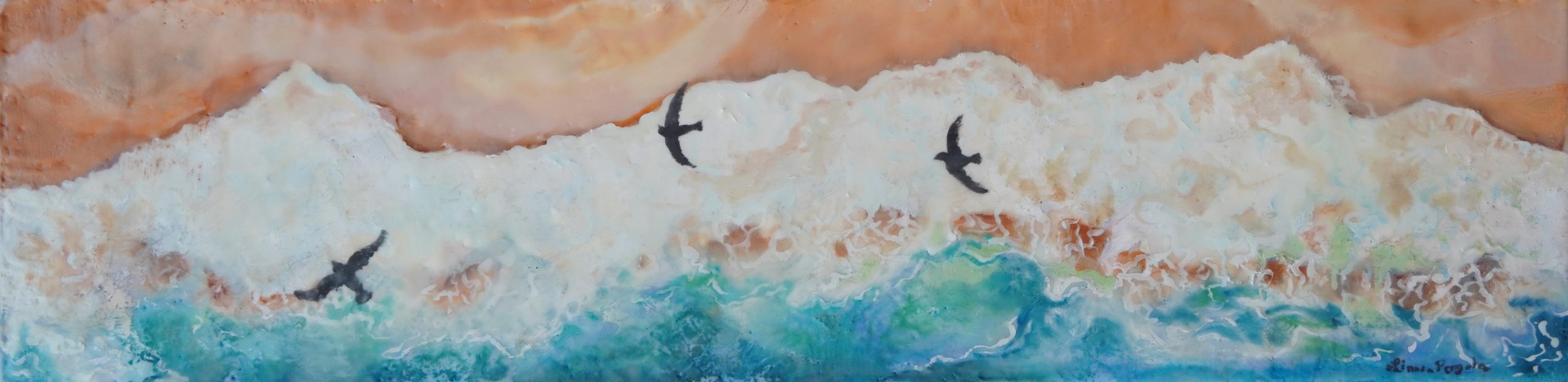 Encaustic and oil of a beach scene with 3 birds.